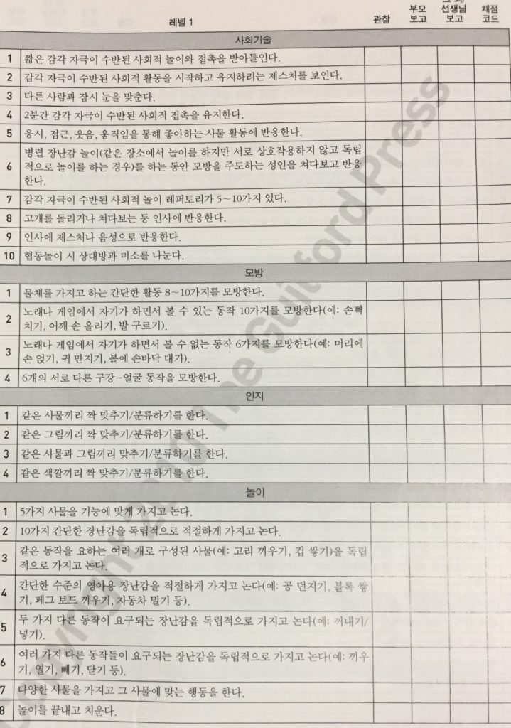 Sally J. Rogers의 어린 자폐증 아동을 위한 ESDM을 이용해 부모보고를 하고 있습니다. 아래 이미지는 체크리스트 샘플입니다. 하위 자료의 저작권은 Sally J. Rogers와 Geraldine Dawson에 있으며, 재배포 및 무단 전재를 금합니다.